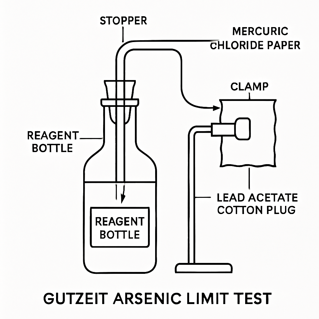 - Principle: Arsenic in the sample is reduced to arsine gas, which passes through mercuric chloride paper, producing a yellow/brown stain compared to a standard stain; compliance is confirmed if the test stain is not deeper than the standard.